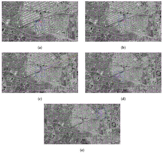 At this altitude, the matching performance is considerably reduced. The lines in the images are weak and inconsistent. The match rate obtained was 21%, and the position error was up to 5.81 m. The visual layout contains a significant deviation. This suggests that match-based positioning loses its precision at high altitudes (Figure 7a,b).