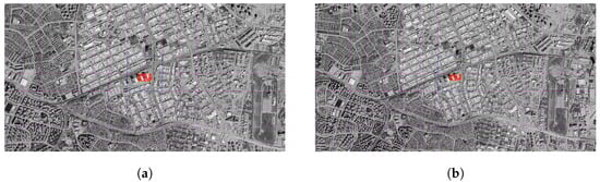 As a result of the matching performed at an altitude of 500 m, it is seen that the AKAZE algorithm performs very successfully. In visual analysis, the matching lines are concentrated at the apparent structure boundaries, and it is clearly observed that the matching area overlaps with the details in the drone image. The area marked in the satellite image covers an area quite close to the actual midpoint of the drone. The geographical difference calculated according to the log record is only 0.36 m, which shows that the system can operate with millimeter accuracy. In this context, it can be said that the AKAZE algorithm provides reliable matches in high-resolution satellite images (Figure 8a,b).