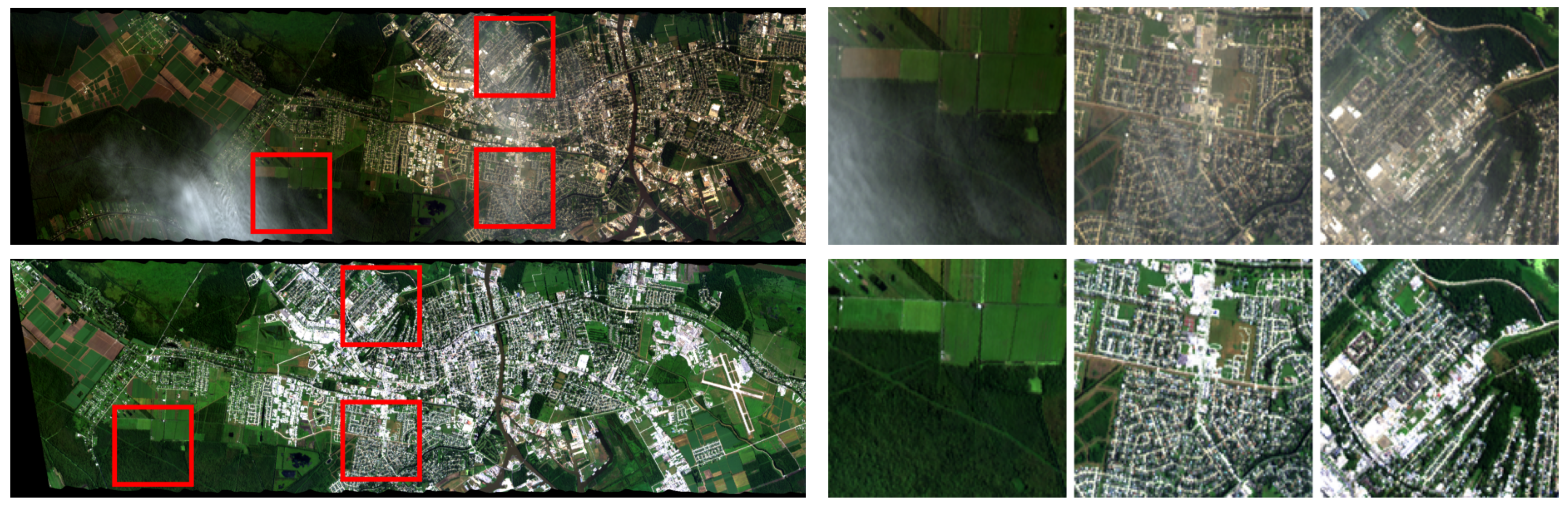 A set of flight-line images consisting of one hazy and one clear image, along with three pairs of manually annotated rectangular areas affected by haze on the hazy flight-line image (highlighted with red boxes).