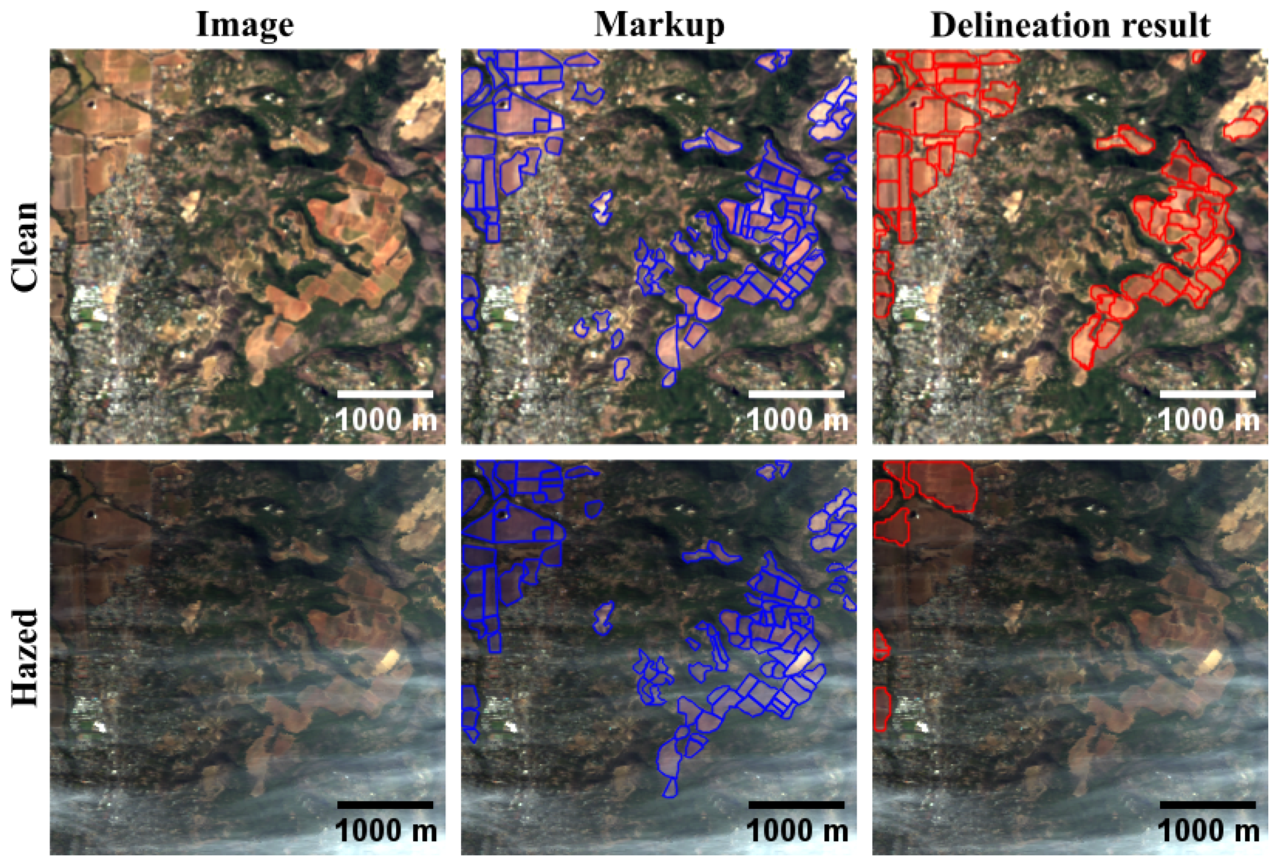 Comparison of the DA agricultural field delineation method results for clean and hazy RGB images.