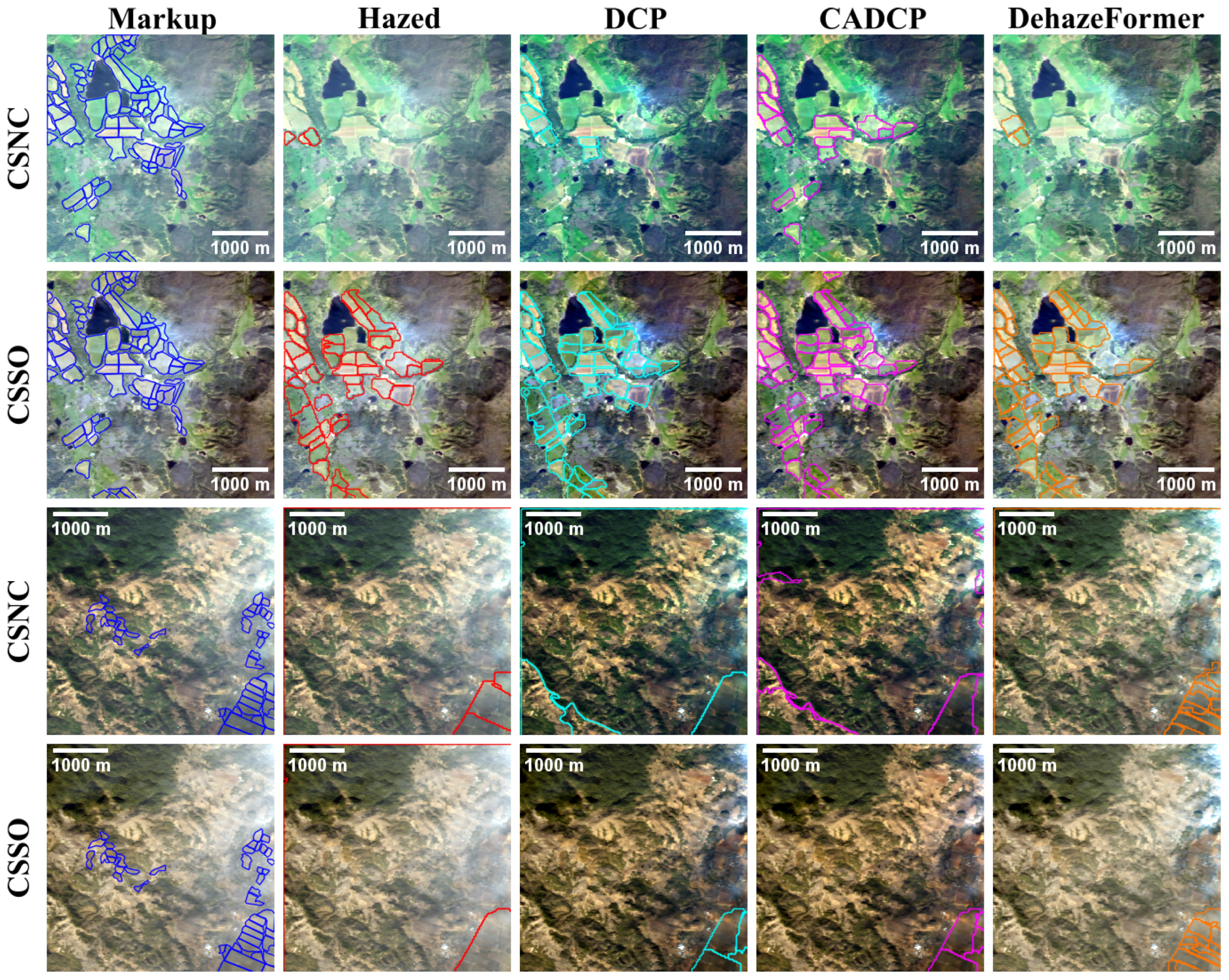 Results of applying the DA method to hazy and dehazed images generated using the CSNC and CSSO RGB synthesis methods. The colors of delineation masks indicate DA results applied to images processed by different dehazing methods.