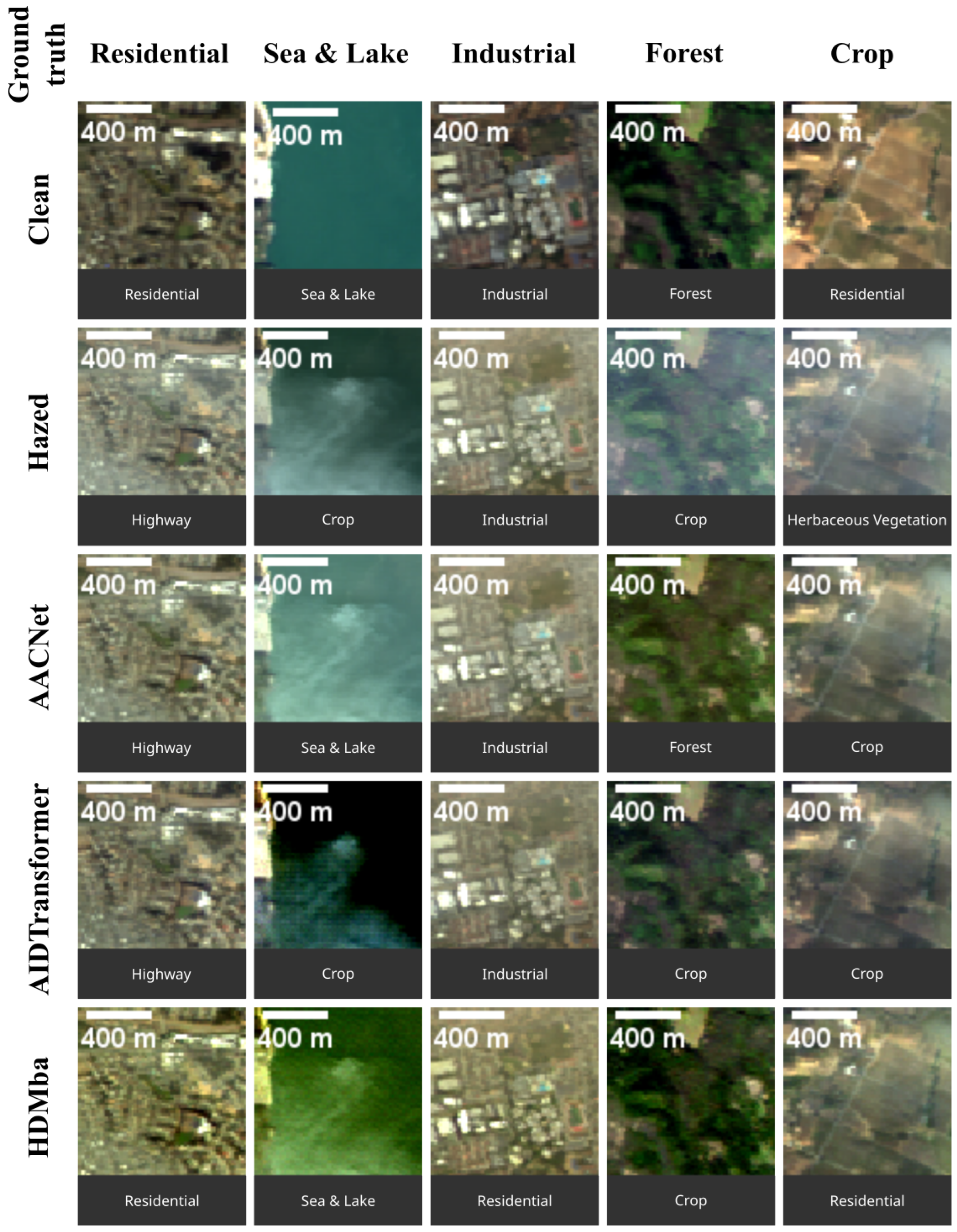 LULC classification results for hazy and dehazed images. The first row shows the ground truth class for each scene. The label below each image patch indicates the class predicted by the classification algorithm.