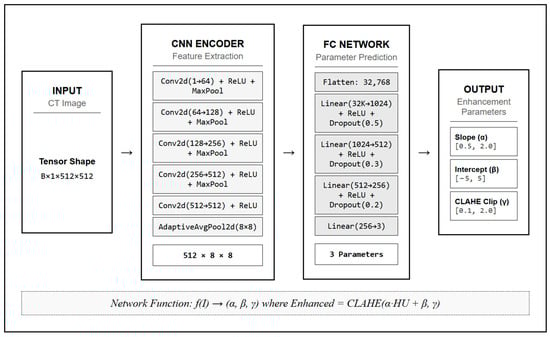 To enhance tissue contrast, we developed a neural network to dynamically optimize the parameters of a linear HU transformation for each individual scan. The neural network architecture, comprehensively detailed in Figure 2, consisted of a CNN encoder for feature extraction followed by fully connected layers for parameter prediction. The CNN encoder included five convolutional layers with batch normalization, ReLU activation, and max pooling, followed by adaptive average pooling to 8 × 8 spatial dimensions. The fully connected network comprised four linear layers with ReLU activation and dropout regularization, ultimately outputting three parameters: slope (α), intercept (β), and the CLAHE clip limit (γ) [].