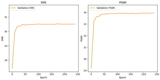 Neural Network Training Convergence of EME and PSNR Metrics During 250-Epoch Enhancement Parameter Learning.