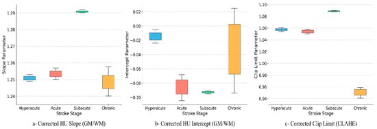 As shown in Figure 6, the learned parameters vary systematically by temporal stage, mirroring stroke pathophysiology. The HU slope remains moderate in hyperacute and acute cases, increases in subacute scans where edema and parenchymal hypodensity are well formed, and decreases again in chronic imaging where margins are naturally clear. Intercepts are slightly negative in hyperacute and become more negative in acute and subacute phases, consistent with increasing hypodensity, then drift toward zero in chronic cases where gliosis and volume loss introduce greater inter-case variability. CLAHE clip limits are conservative early, peak in the subacute stage to accentuate lesion–background separation and are reduced in chronic scans to avoid over-sharpening established changes. These findings align with reports that attenuation-based metrics are stage dependent and benefit from context-aware parameterization rather than one-size-fits-all thresholds [,].