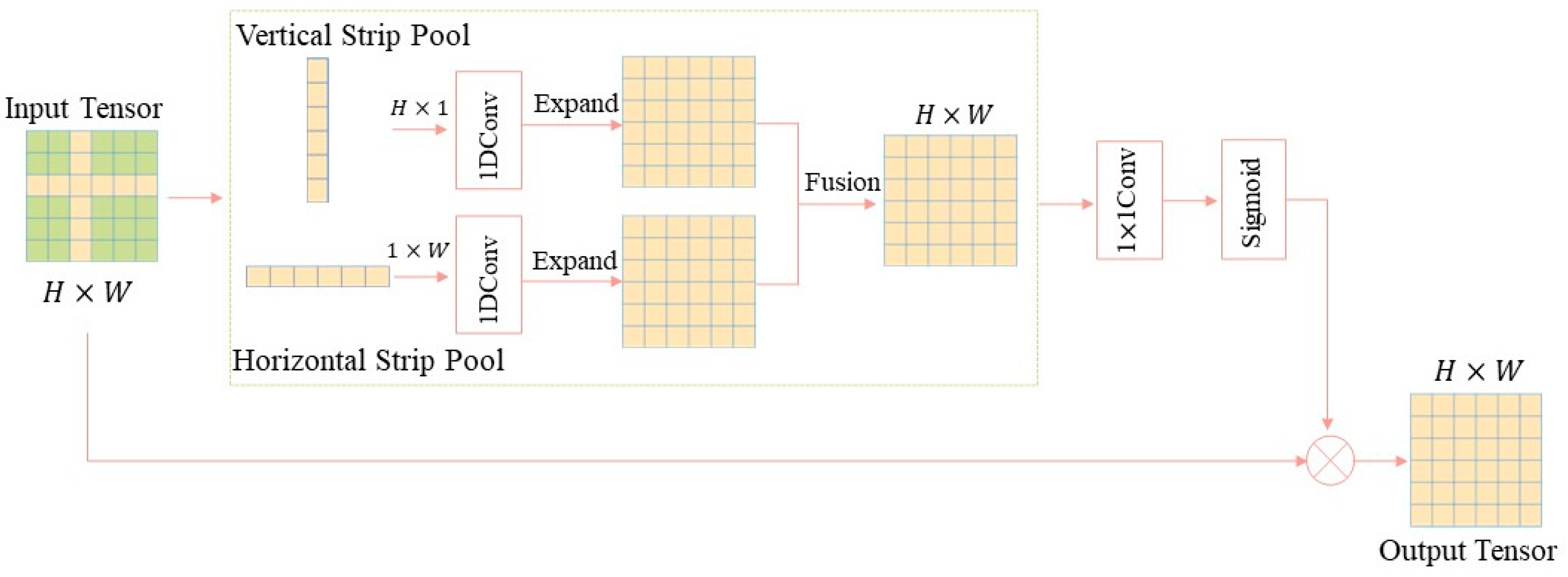 - Hou, Q.; Zhang, L.; Cheng, M.M.; Feng, J. Strip pooling: Rethinking spatial pooling for scene parsing. In Proceedings of the IEEE/CVF Conference on Computer Vision and Pattern Recognition, Seattle, WA, USA, 13–19 June 2020; pp. 4003–4012. [Google Scholar]