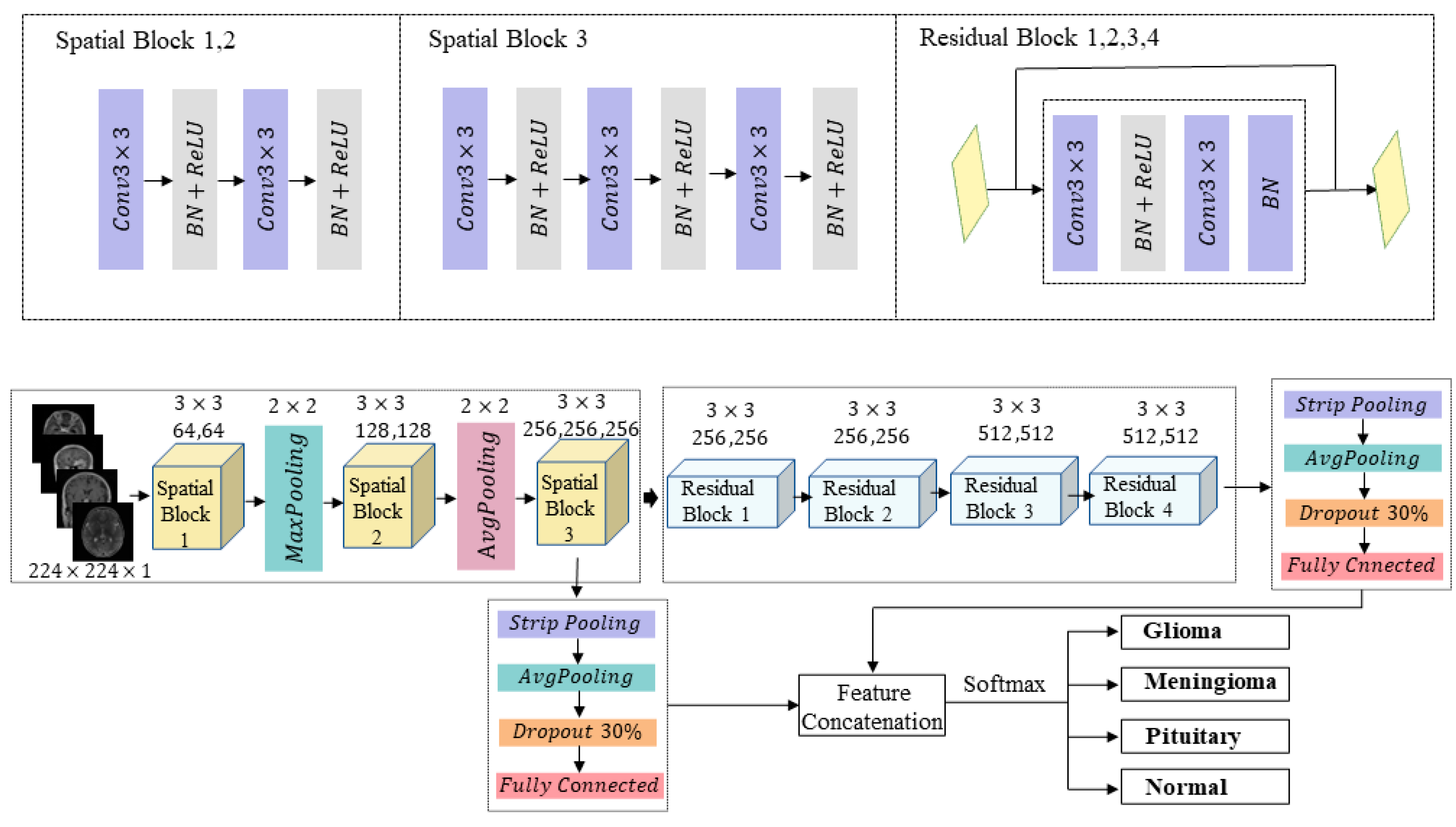 Tang, M.; Zhou, X.; Li, Z. Brain Tumour Classification Model Based on Spatial Block–Residual Block Collaborative Architecture with Strip Pooling Feature Fusion. J. Imaging 2025, 11, 427. https://doi.org/10.3390/jimaging11120427