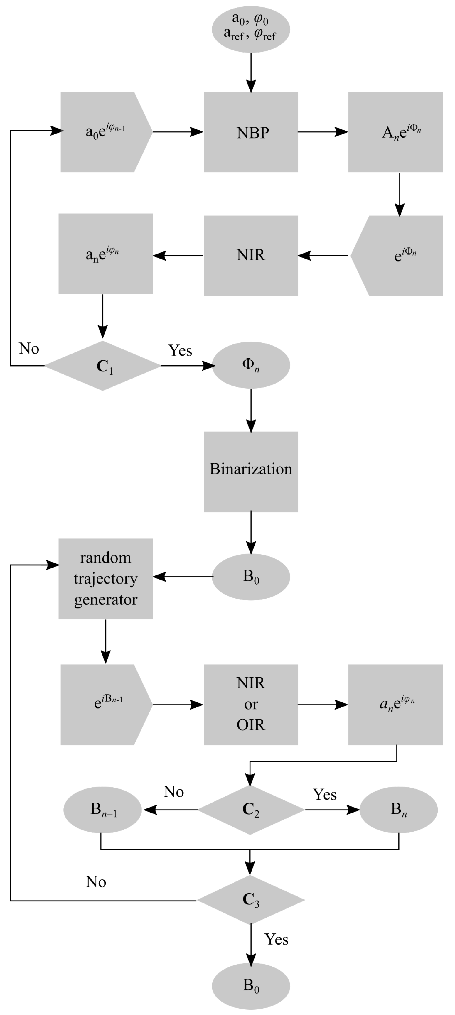 Figure 1 shows the operational flowchart of the implemented two-stage CGH synthesis algorithm. The first stage realizes a standard iterative GSA with the following input parameters: a 0 —the matrix of the object beam spatial amplitude distribution that represents the holographic image; ϕ 0 —the matrix of the initial object beam phase factor to be optimized; a ref and φ ref —the matrices of amplitude and phase distributions of the reference beam. Starting from the initial distribution matrix of the holographic image complex amplitude u 0 = a 0 exp ( i ϕ 0 ) , the algorithm iterates through the computation of numerical backward propagation (NBP) onto the hologram plane, hologram amplitude unification, and numerical image reconstruction (NIR) until the conditional test C1 is satisfied. NBP includes the calculation of the reversed propagation integral and the division of the result on the reference beam complex amplitude function. NIR includes multiplication of the phase-only function of kinoform on the reference beam complex amplitude function and the calculation of the forward propagation integral. If on n-th iteration condition C1 is satisfied, the iterations stop, and the algorithm produces the phase distribution function Φ n for binarization and further processing. Condition C1 calculates and analyzes the error function L n [43]. Similar to [24], the following loss function was used within this work:
