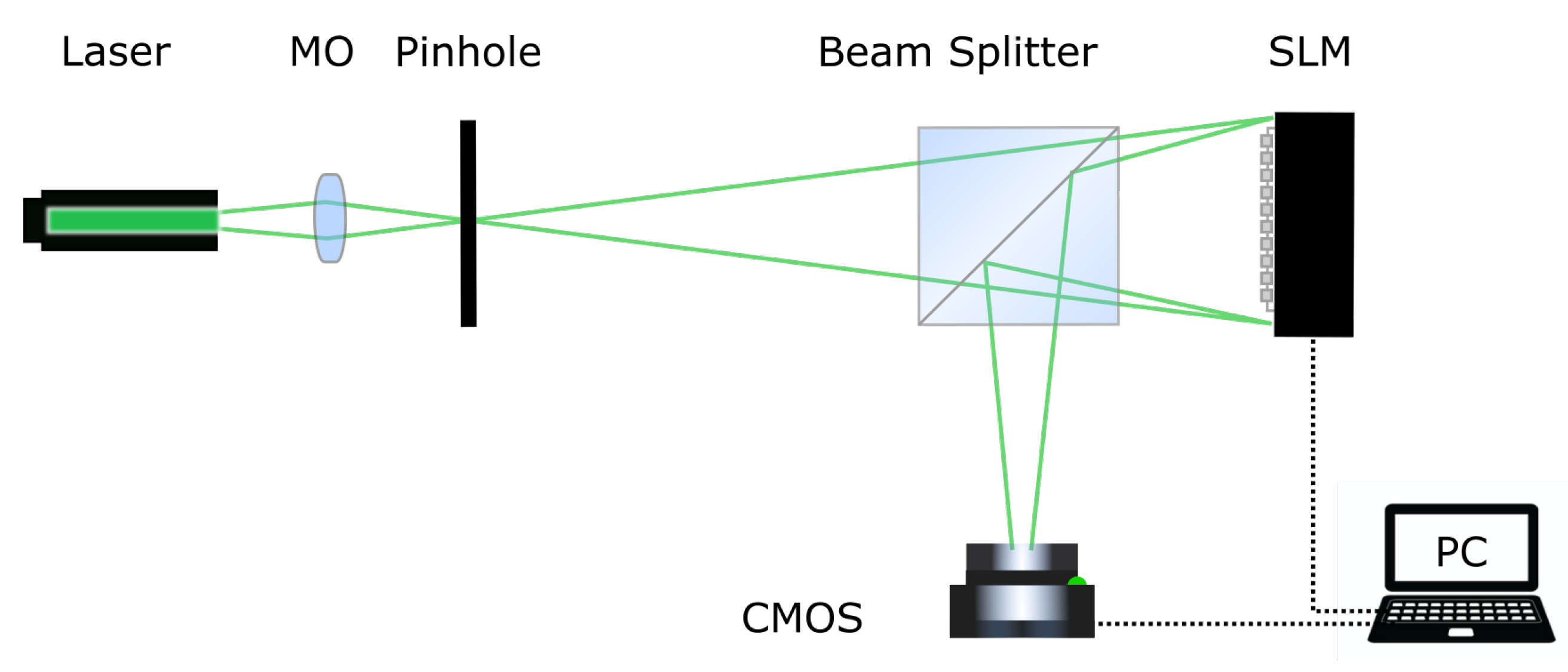 Figure 2 represents the experimental setup for the optical implementation of the DSRT method. A Cobolt Samba Nd:YAG laser with a wavelength of 532 nm and an output power of 200 mW was used as the light source. A microlens and a pinhole diaphragm formed a divergent spherical reference beam. A HoloEye PLUTO-2-VIS-016 LCOS SLM with a resolution of 1920 × 1080 and a pixel pitch of 8 μ m was mounted 90 cm from the pinhole diaphragm. A Flare 48M CoaXPress CMOS camera with a resolution of 7920 × 6004 , a full resolution frame rate 30.9 fps, and a pixel pitch of 4.6 μ m was used to acquire the restored holographic images. Since the LCOS SLM is a reflective display, a beam splitter cube was used in the setup. The optical distance between the SLM and the camera was 45 cm. The SLM and the camera were synchronized with a 60 Hz signal, but both were programmed to perform the iterative display of CGHs and to acquire the holographic image at a frame rate of 5 Hz. The camera exposure time was set to 8.5 ms. This limitation were due to the low response time of the LCOS SLMs, as measured previously [44,45]. Both the SLM and CMOS camera were connected to a personal computer, which implemented the CGH synthesis and realization algorithms, as well as the acquisition, digitization, and processing of the restored holographic images.