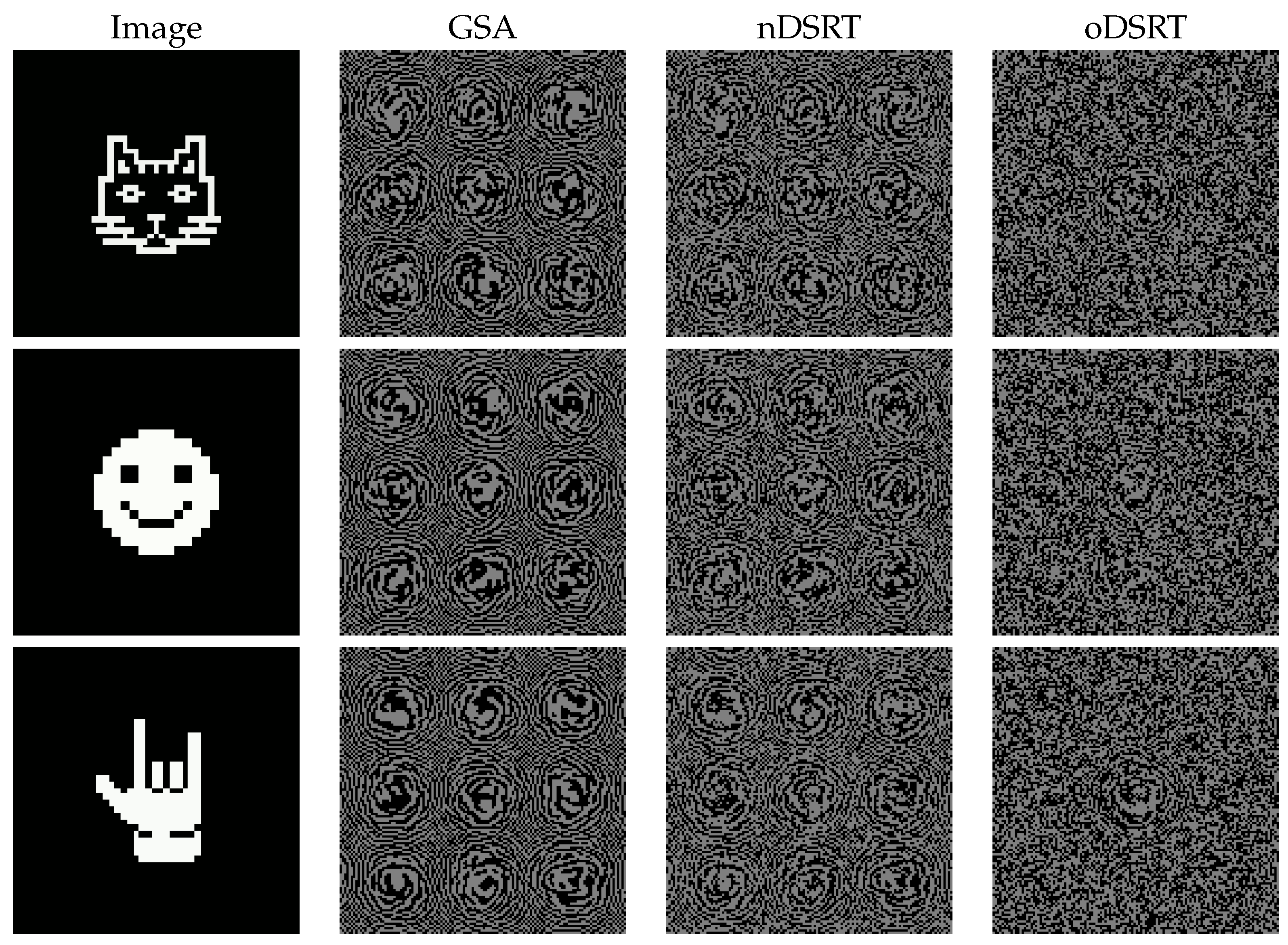 The generation of a CGH fringe pattern model using GSA allows for the optimization of the initial random phase distribution of the object beam into a specific distribution of the spatial phase portrait that provides the increased quality of the holographic image reconstruction from an amplitude-only or phase-only kinoform. However, stagnation of the GSA after several dozen iterations results in limited quality improvement. As previously shown [24], a sufficient increase in reconstruction quality can be achieved if the binary GSA-generated fringe pattern is subjected to the DSRT method. Thus, the next stage of the algorithm is the implementation of the DSRT method.