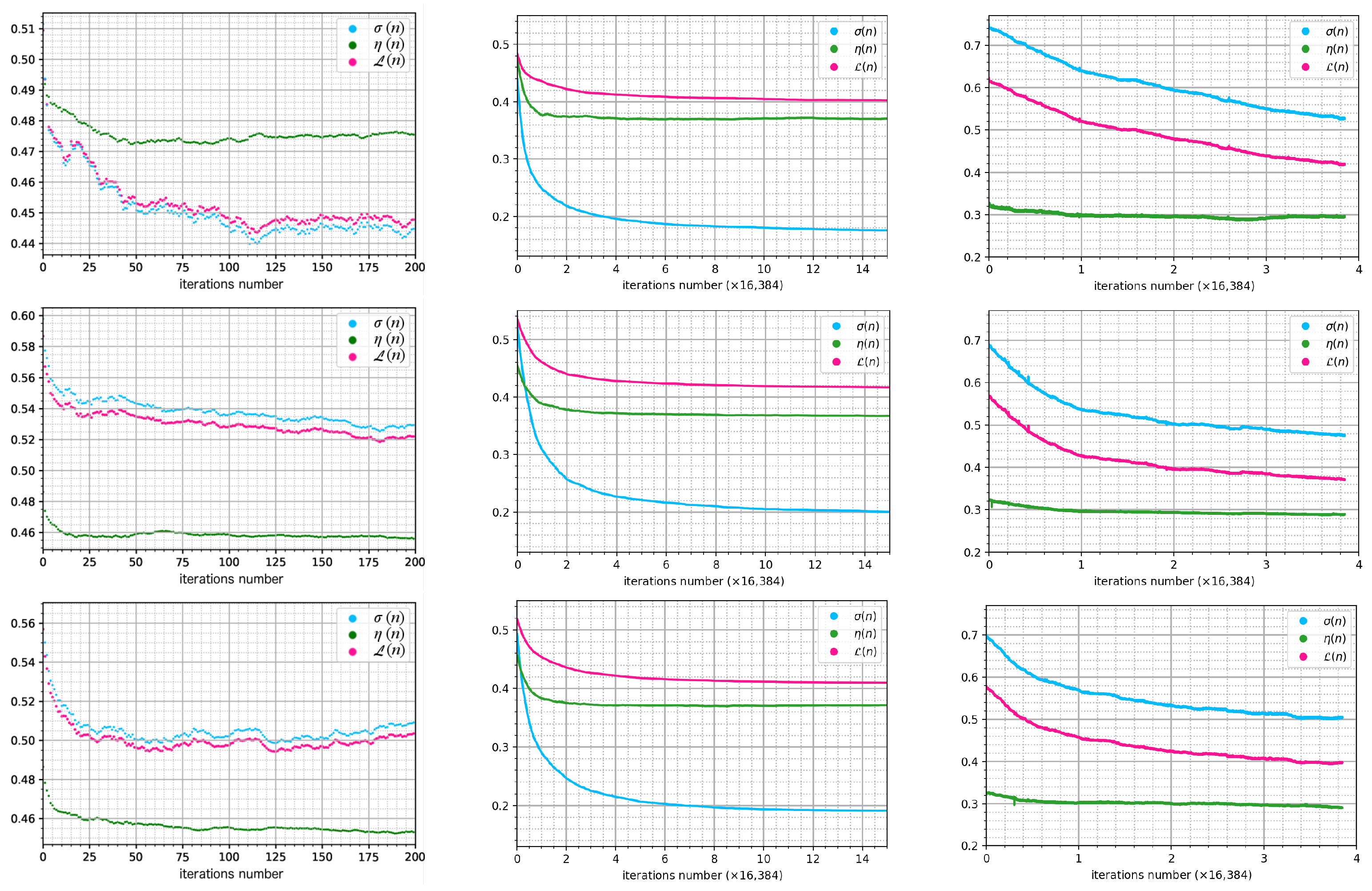 Figure 4. σ ( n ) , η ( n ) , and L ( n ) in accordance with the iteration number n for the GSA (left column), nDSRT (center column), and oDSRT (right column) stages of the three-stage algorithm implementation for the objects “cat” (top row), “smile” (middle row), and “rock” (bottom row).