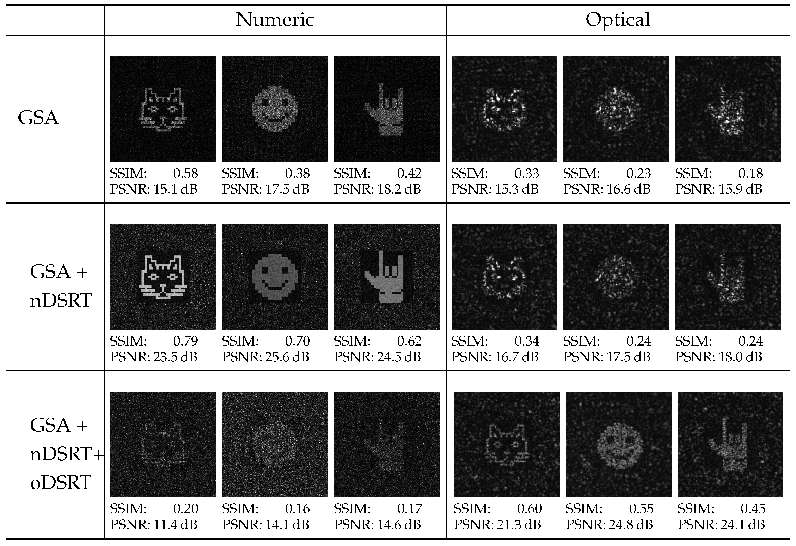 Figure 4 and Figure 5 show that GSA-generated holograms provide up to 0.45–0.47 of the DE of numerically restored images, with sufficient quality to distinguish object details. The following nDSRT stage presents a significant improvement of the numerically restored holographic images by means of NSTD (minimum 0.19), SSIM (maximum 0.79), and PSNR (maximum 25.6 dB), with a reduction in DE of 15%. The physical realization of both binarized GSA-generated CGHs and nDSRT-optimized binary-phase CGHs in the optical system using the phase-only SLM showed a significant degradation in the quality of the optically restored holographic images that appeared distorted by speckle noise with almost invisible details. Nevertheless, both the SSIM and PSNR values demonstrate slight improvement in the optical reconstruction quality after CGHs optimization in the nDSRT stage for all three objects. For the optical reconstruction of holographic images by the nDSRT-optimized CGHs, the minimum NSTD obtained is 0.68, which is consistent with value obtained for the optical reconstruction of GSA-synthesized CGH. The maximum SSIM value is 0.34, and the maximum PSNR is 18.0 dB. The implementation of the oDSRT stage resulted in a sufficient improvement in the quality of the optically restored holographic images, providing detailed reconstruction with suppressed speckle noise and low background level. For oDSRT-optimized CGHs, the minimum NSTD value obtained is 0.46, the maximum SSIM value is 0.60, and the maximum PSNR value is 24.8 dB. The measured diffraction efficiency for GSA-generated CGH in the optical setup ranged from 0.37 to 0.39; for nDSRT-optimized CGHs, it was about 0.32, and for oDSRT, it was about 0.28 for all three cases. During the physical realization of GSA-synthesized and binarized CGHs and nDSRT-optimized binary-phase CGHs in the optical setup, a 25% reduction in DE was observed compared to the numerical results. This reduction may be due to imperfections in the optical setup that were not considered in the numerical simulations, such as the non-uniform spatial distribution of read-out beam intensity, aberrations, the non-uniform spatial phase shift of the LCOS SLM, and reflections from the SLM pixels not involved in the CGH display.