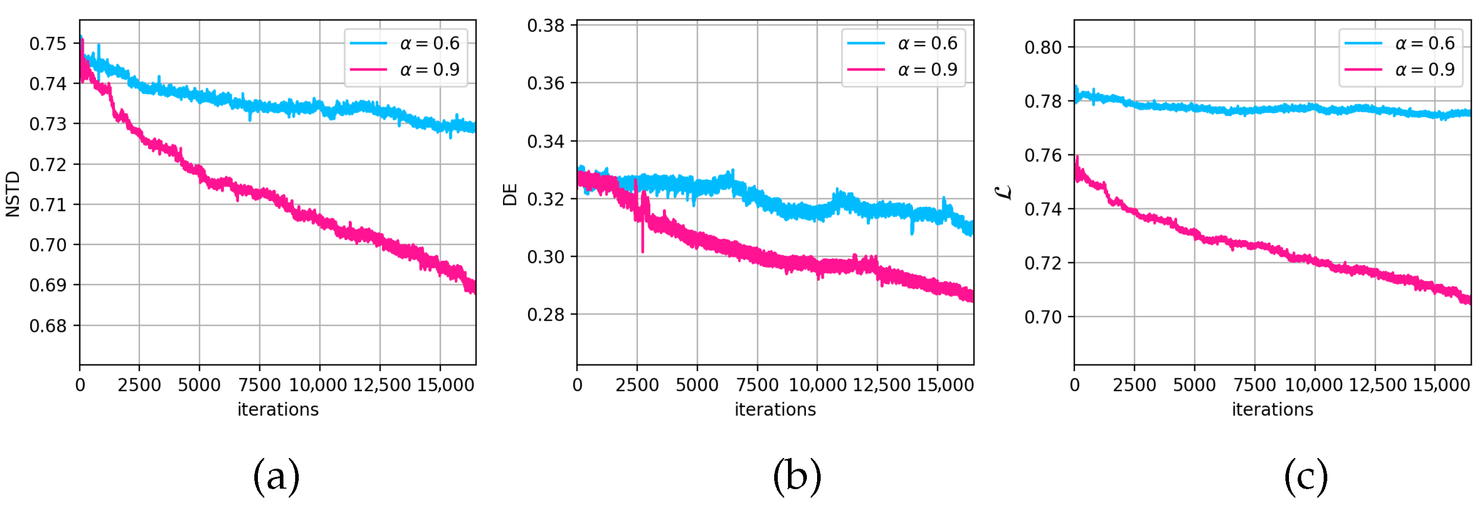 Figure 8. Comparison of NSTD (a), DE (b), and target function (c) evolution for cases of α equal to 0.6 and 0.9.