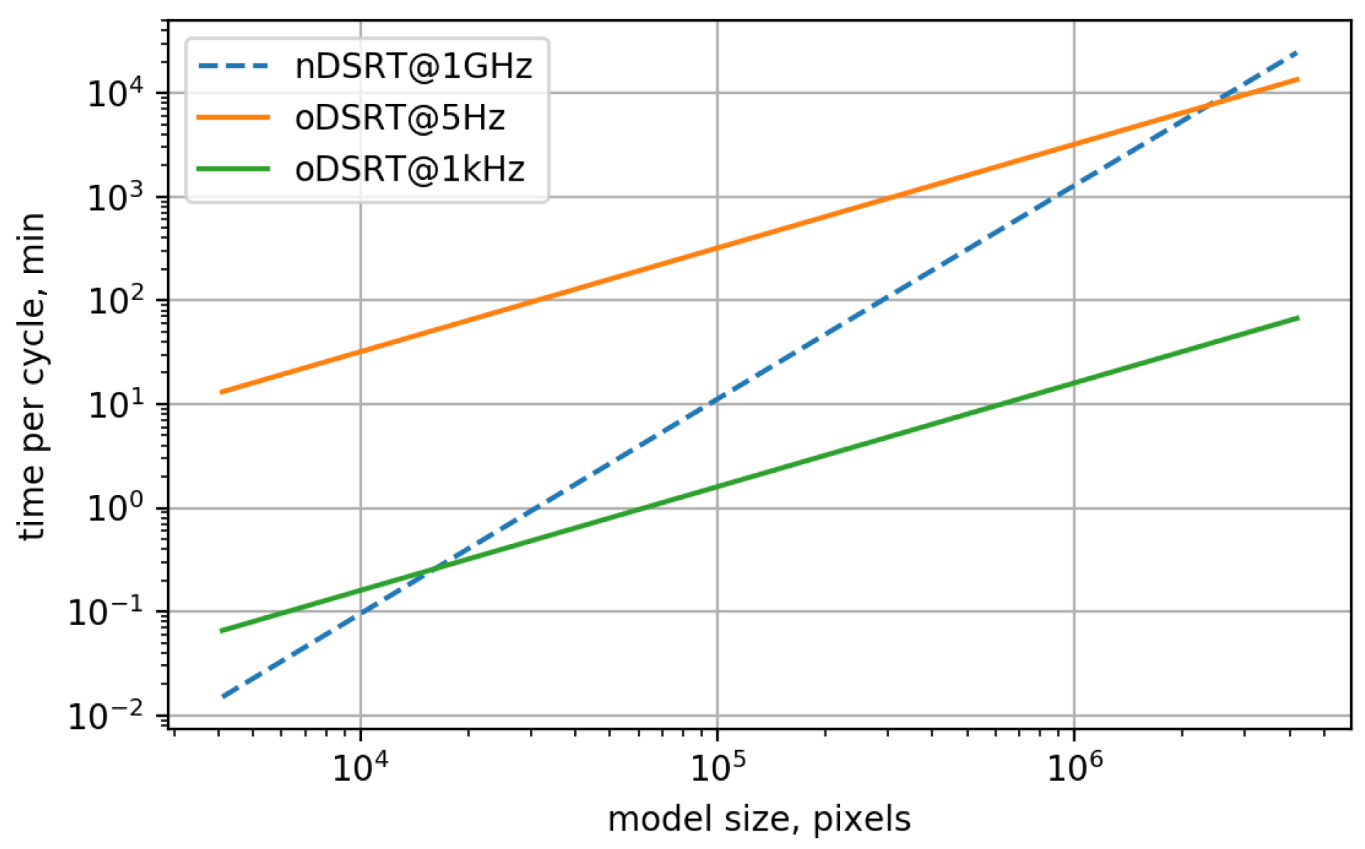 Figure 9. Time per cycle of full matrix update in accordance with model size for implementations of nDSRT with a processor frequency of 1 GHz and oDSRT at an SLM frame rate of 5 Hz and 1 kHz.