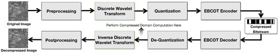 Many HSI compression algorithms utilize DWT, with JPEG2000 being the most prominent example. Based on JPEG2000, this paper explores how to implement deep learning computations directly in the compressed-domain. As shown in Figure 2, the JPEG2000 compression process comprises the following steps: (1) Preprocessing: including image tiling, DC shifting, and component transformation, which provide a more suitable data representation for subsequent wavelet transform and encoding processes. (2) DWT: This is the core step of the JPEG2000 algorithm, decomposing the image into four frequency sub-bands that capture both high-frequency and low-frequency information of the image. (3) Quantization of wavelet coefficients: This lossy step discards certain data to reduce the overall file size. (4) Encoding of quantized wavelet coefficients using Embedded Block Coding with Optimized Truncation (EBCOT) to obtain a compressed bitstream. EBCOT is an entropy encoding technique used to further compress image data and remove redundancy.