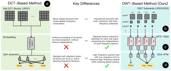 Structural comparison between DCT-based and DWT-based compressed-domain paradigms. (a) DCT-based methods typically process blocks with mixed spatial-frequency components using uniform projections. (b) In contrast, the DWT domain exhibits a hierarchical structure with distinct frequency sub-bands, which existing block-based methods fail to address. (c,d) illustrate the proposed sub-band independent processing and feature alignment strategies.