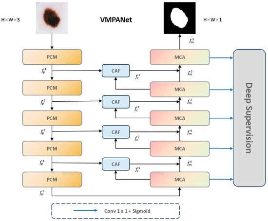 This section comprehensively describes the design of VMPANet, a lightweight network tailored for skin lesion image segmentation. We first introduce the overall architecture of the model, then detail the three core modules (PCM, MCA, CAF), respectively, including their structural designs, working mechanisms, and mathematical formulations. Finally, the loss function adopted in the training process is presented to address the specific challenges of skin lesion segmentation.