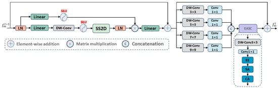 Considering the limitations of convolution operations in exploring features within a limited domain, we introduced visual Mamba to capture global long-range dependencies, allowing the extraction of comprehensive feature representations . Subsequently, we applied convolutions to enhance feature expression capability and map to , as shown in Equations (1) and (2):