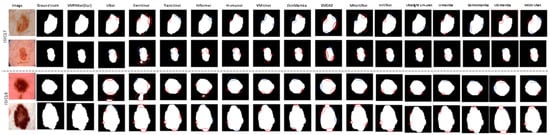 We also conducted a visual comparison of our method against sixteen mainstream approaches on the ISIC17 and ISIC18 datasets, as shown in Figure 8. Most methods struggle with segmenting the complex edge structures of lesions, whereas VMPANet demonstrates superior robustness in handling these complexities. Many methods face challenges with low contrast and background interference, but VMPANet effectively addresses these issues, producing smoother and more accurate contours and boundaries. Overall, our method emphasizes both global and local information, as well as multi-scale information at different granularities, to capture significant targets in medical images. While edge enhancement can learn the differences between edge and non-edge regions to complement target contour details, it introduces errors, making it difficult for models to capture fine details in low-contrast and complex edge scenarios. Our spatial and channel attention mechanisms enable the model to adaptively focus on important targets, enhancing robustness against interference. Furthermore, we incorporate a self-attention mechanism to facilitate the complementarity between deep semantic information and shallow detail information, thereby thoroughly identifying significant targets in complex tissues.