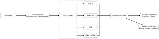 Overall, the four architectures share a common preprocessing pipeline (normalization and skull-stripping) and generate a binary segmentation mask, which is subsequently transformed into a visual color map and an auditory sonification output (Figure 1, Figure 2, Figure 3 and Figure 4).