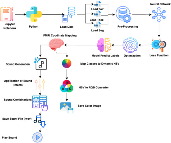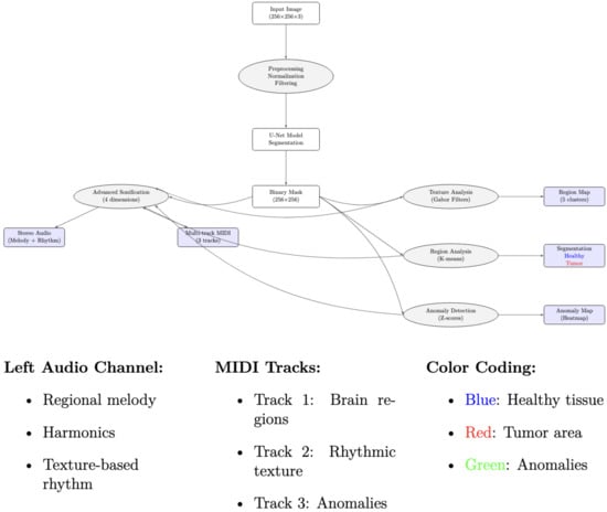 Figure 5. Overview of the multimodal sensory pipeline for brain MRI segmentation. The pipeline integrates deep learning-based segmentation, anomaly detection, and visual (color-coded maps) and auditory (stereo audio and MIDI) representations.