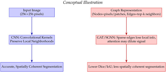 The GAT-based architecture reformulates segmentation as a message-passing process over a graph derived from intermediate feature maps, capturing spatial relationships not easily learned by convolutions.