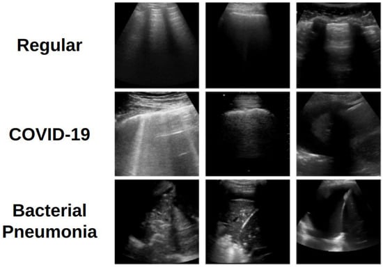 The same preprocessing steps described in [19] have been adopted, with a maximum of 30 frames per video extracted. Each frame was cropped to remove textual annotations and border artifacts and then resized to 128 × 128 pixels to meet computational constraints. Pixel intensities for each image were normalized to the range −1 to +1. A total of 3191 images were extracted (1191 for COVID-19, 708 for bacterial pneumonia, and 1292 for regular/healthy). For training and evaluation, the data were partitioned using stratified 10-fold cross-validation at the patient level, ensuring that no patient appeared in more than one fold. Examples of the preprocessed images are provided in Figure 1.