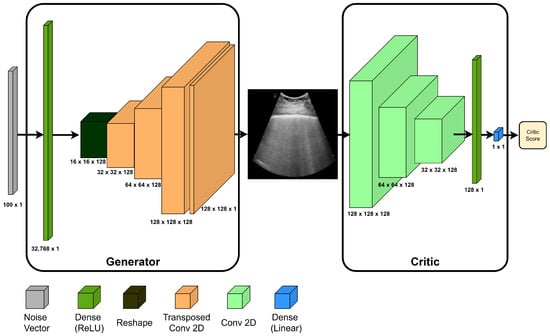 Several studies have investigated applications of GANs to ultrasound imaging. For data augmentation, these models have been used to generate synthetic images for breast ultrasound, transcranial ultrasound, intraoperative liver ultrasound, and functional ultrasound for neuroimaging, among others [35,36,37,38,39,40]. More recent works have expanded the use of GANs beyond image generation, applying them to a wide range of tasks, including the generation of masks for semantic segmentation of key structures in cardiac ultrasound [41], lesion segmentation in breast ultrasound scans [42], domain adaptation across different ultrasound machines and acquisition protocols [43,44], and speckle noise reduction in ultrasound images [45], while many of these approaches rely on adaptations of established GAN architectures, the most commonly adopted state-of-the-art models include Wasserstein GAN (WGAN), Pix2Pix GAN, CycleGAN, Progressive Growing GAN (ProGAN), and Super-Resolution GAN (SRGAN) [34,46].