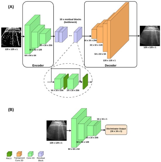 The Pix2Pix generator adopts an encoder-decoder structure. As for the discriminator, it operates at the patch level (PatchGAN, as proposed in the original paper), averaging local classifications to compose the final output. A generator architecture inspired by [36] was adopted in this study, which employed residual blocks at the bottleneck of the encoder-decoder. The topologies for the Pix2Pix generator and discriminator are shown in Figure 3. Batch normalization and dropout (0.5) were included after each convolutional layer, which used a 3 × 3 kernel. The ReLU activation function was applied on each convolutional layer.