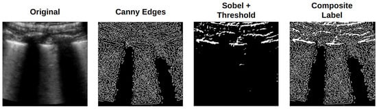 Although the described processing aimed to capture the location of specific LUS artifacts, it may have discarded fine-grain texture information that could also be clinically relevant [36]. To account for this, the Canny method for edge detection used in Liang et al. [36] was also employed. Accordingly, three different scenarios for Pix2Pix training were evaluated: (i) using images produced by Sobel filtering followed by pixel thresholding (Sobel + threshold), (ii) images derived exclusively from Canny edge detection (Canny edges), and (iii) a combined approach integrating both methods, referred to as composite labeling. Examples are shown in Figure 5.
