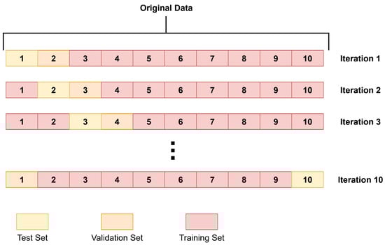 As previously mentioned, a patient-level stratified k-fold cross-validation (k = 10) has been used to split the data for training both the GAN and classifier models. The experimental data were divided into k disjoint subsets with a similar number of patients. In each iteration, one of these subsets was designated as a test set (hold-out), another as the validation set (used for hyperparameter tuning and early stopping), and the remaining subsets as the training set. Figure 6 illustrates the k-fold data split, while Figure 7 depicts the whole training process repeated across all iterations. As shown in Figure 7, both the GAN and the classifier used the same training, validation, and test partitions, preventing data leakage when training the classifier with synthetic data.