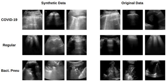 While these studies reported promising results and contributed to advance deep learning methods for COVID-19 detection, they were constrained by the scarcity of medical data—a challenge particularly evident in the context of LUS, given the limited number of publicly available datasets (which is explained due to the use of ultrasound as a medical urgency procedure during the pandemic to make quick decisions and usually without preserving the images obtained) [15]. Training deep learning models—which have a massive number of parameters—on datasets with a small number of observations might lead to overfitting, which hinders the use of the model to classify new observation not seen during the training step [28]. One potential way to mitigate this issue is the use of synthetic data generation, with generative adversarial networks (GANs) showing promising results and receiving growing attention in recent years [29,30]. By leveraging adversarial training between two neural networks, GANs are capable of learning rich data representations, thereby alleviating the dependence on large annotated datasets since they can generated synthetic samples based on these data representations that can be used to train the classification models [31]. In the medical domain, recent studies have investigated GAN-based data generation across a variety of imaging modalities, including MRI, CT, and dermoscopy for skin cancer [32,33]. However, there are also applications beyond image synthesis, such as image segmentation, denoising, enhancement, and super-resolution across various examination modalities [33,34].