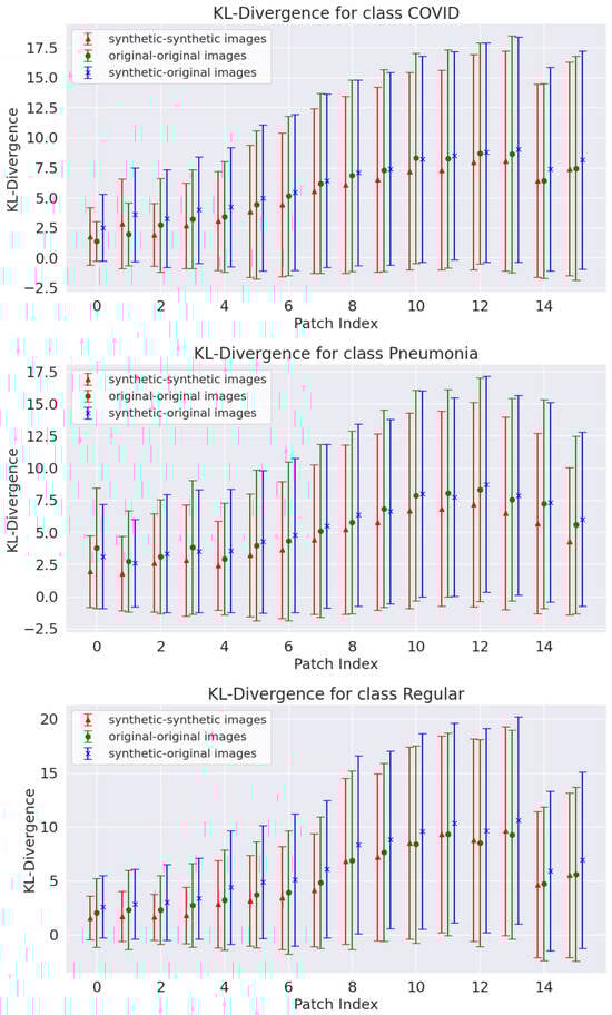 Patch-level KL divergence for pairs of original and synthetic images for the three classes (results for fold 1 of k-fold cross-validation).