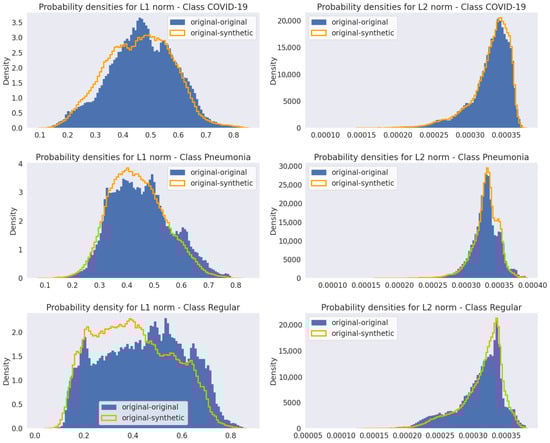 L1 and L2 norms probability densities for original-original and original-synthetic images for the first fold of the k-fold cross-validation.