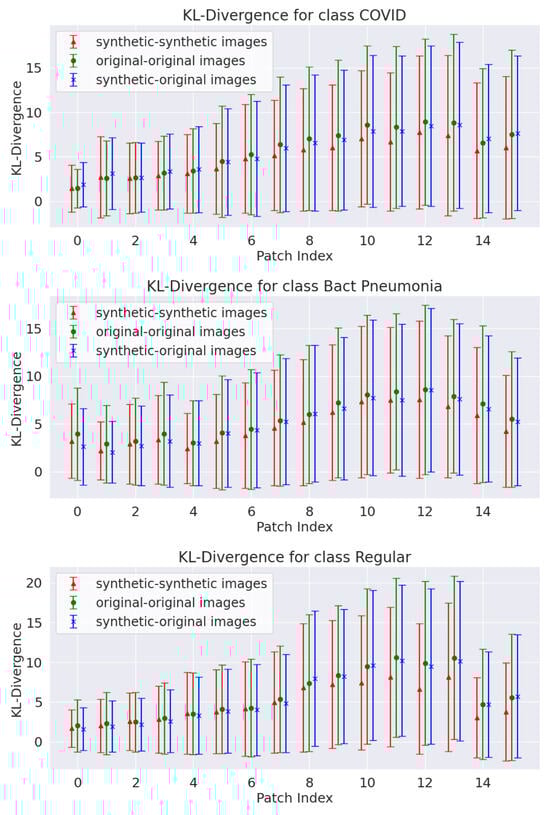 Given the importance of LUS artifacts for diagnosis (such as the pleural line and B-lines), the images were divided into patches rather than comparing the full images using Equation (5). The patch size used was such that the pleural line was contained in one or two consecutive patches, resulting in 16 patches per image. The KL divergence computation estimates whether the fluctuations for patch regions of the synthetic data are within the fluctuations from the original dataset. If so, it would indicate that the generated data followed the probability density function (PDF) of the original data for such regions.