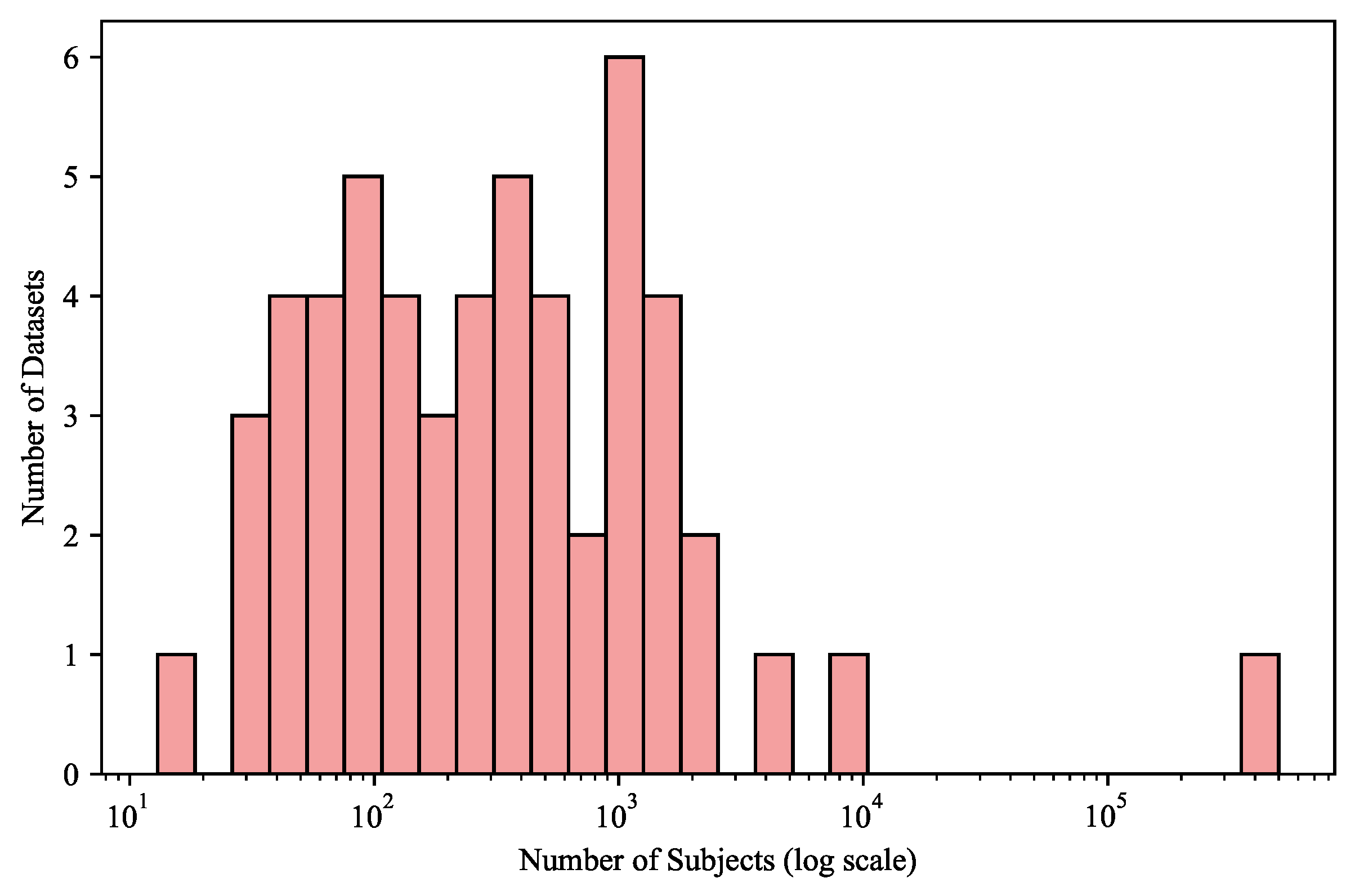 Figure 2) exposes an extreme imbalance in the public brain MRI landscape. A single dataset—UKBioBank—accounts for more than 500,000 subjects, while nearly all other datasets range from a few dozen to a few thousand participants. Yet when examined alongside disease coverage, the relationship between scale and content becomes more revealing: the largest datasets are almost exclusively composed of healthy or aging populations, whereas smaller datasets concentrate on specific pathologies such as brain tumors, stroke, and multiple sclerosis. In other words, data abundance is inversely correlated with clinical complexity.