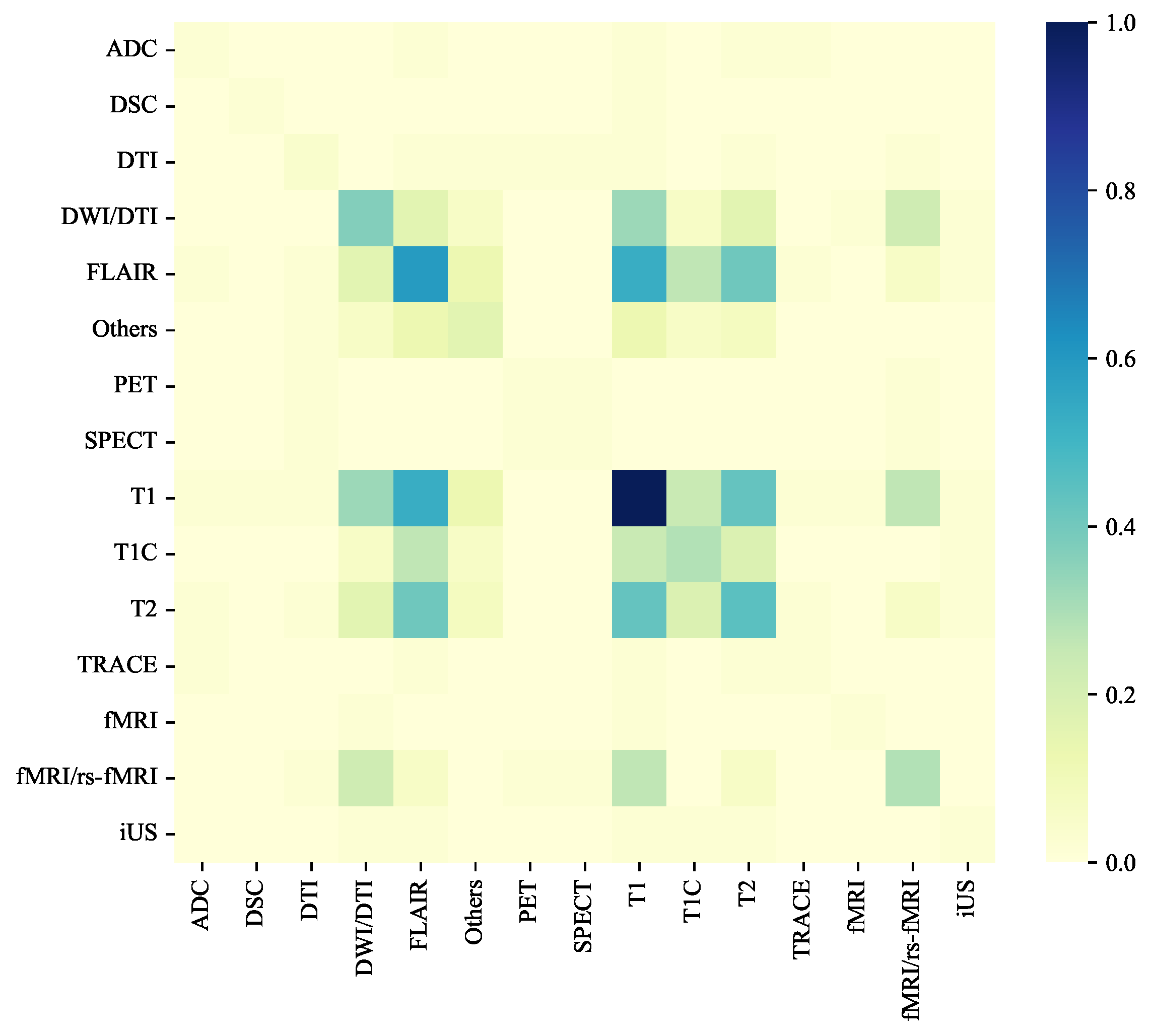 Figure 3) reveals distinct pairing patterns among structural MRI sequences across public datasets. The most frequent combination is between T1-weighted and FLAIR scans, followed by T1–T2 and T1–T1C pairs. These sequences commonly co-occur within multi-contrast structural datasets such as BraTS, ADNI, and MSSEG, where complementary contrasts are used to capture both anatomical boundaries and pathological hyperintensities. Moderate co-occurrence is also observed among FLAIR, T2, and T1C, indicating a tendency for lesion-focused studies to integrate multiple structural contrasts that highlight different tissue characteristics. In contrast, single-modality datasets remain prevalent, particularly among population studies (e.g., IXI, OASIS), which provide only T1-weighted scans.