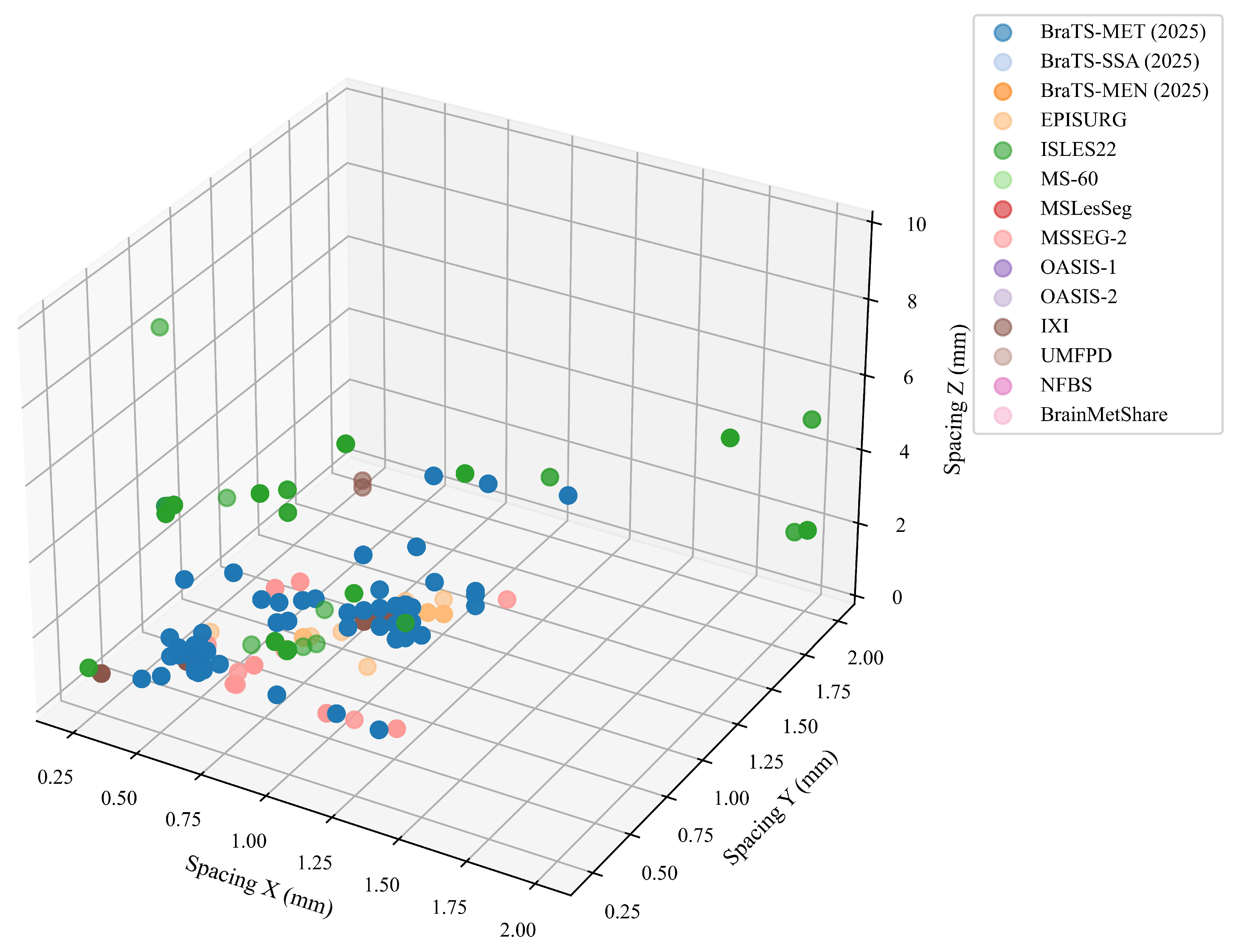 Figure 4 shows the 3D distribution of voxel spacings across 14 representative datasets. Most datasets cluster near isotropic spacing around