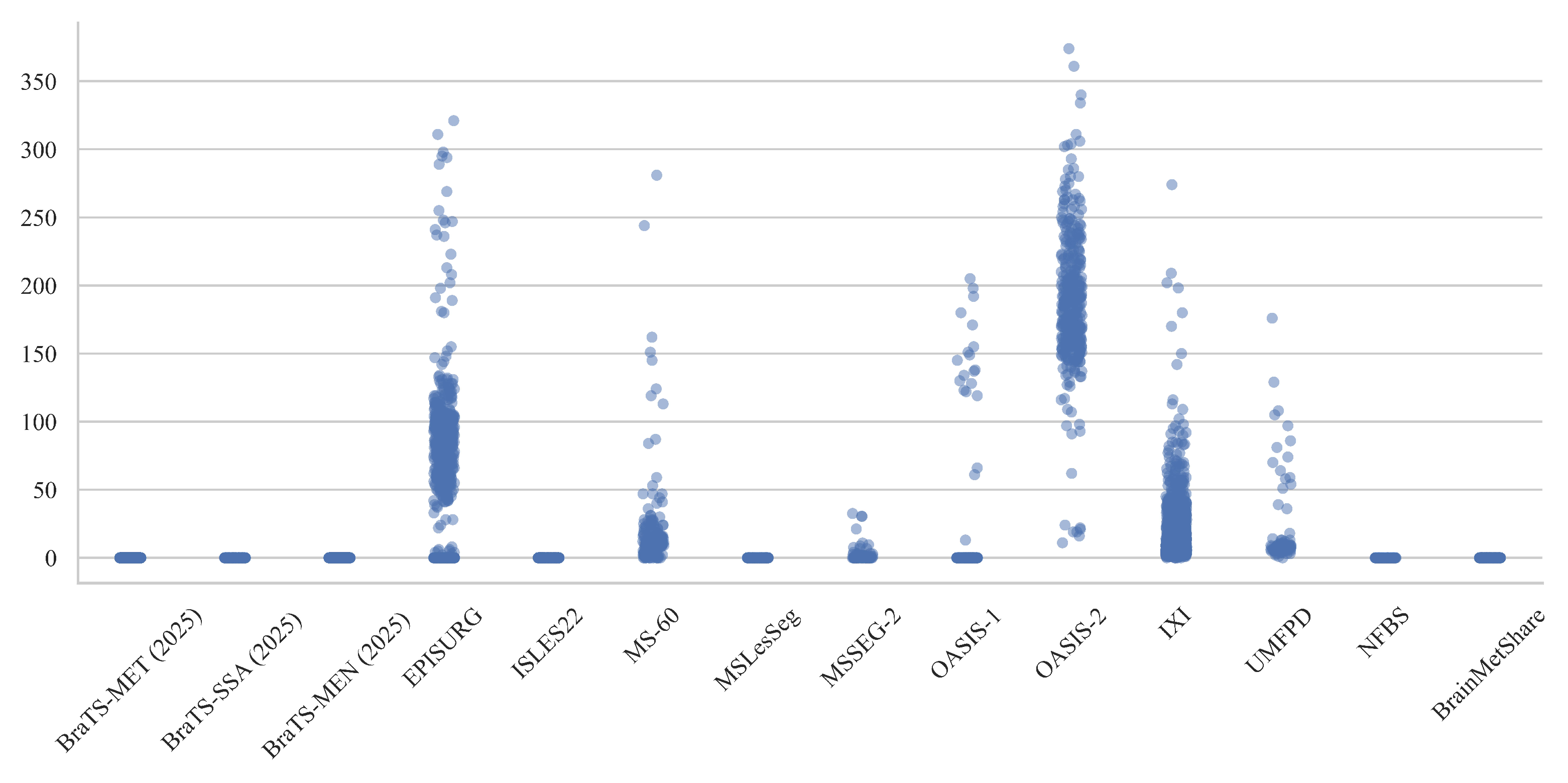 Figure 5 illustrates the distribution of median voxel intensities across representative datasets. Datasets such as EPISURG, OASIS-1, OASIS-2, and IXI exhibit wide intensity variability, whereas others (e.g., the BraTS series, ISLES22, MSLesSeg, and BrainMetShare) show lower and more stable median values. This disparity likely arises from differences in scanner calibration, rescaling conventions (e.g., 0–255 versus z-scored), and preprocessing intensity normalization methods. The OASIS datasets, for example, show extensive dispersion with median intensities exceeding 300, reflecting a broad dynamic range and the absence of uniform scaling. In contrast, the BraTS and MS-related datasets exhibit tight clusters around zero, suggesting that bias correction and standardized normalization were consistently applied.