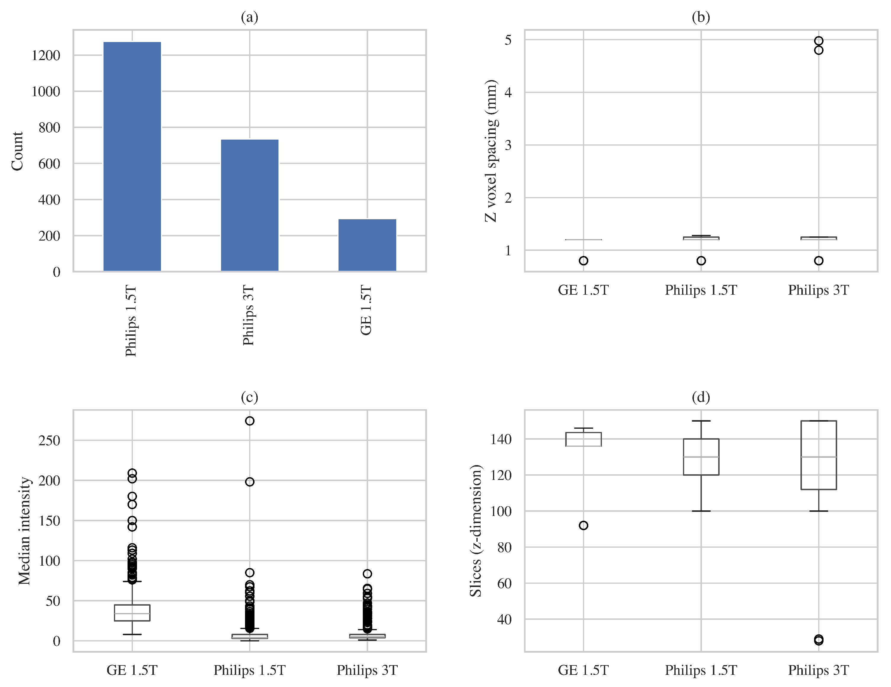Figure 6, the scanners differ in how many scans they contribute, the voxel spacing they use, their intensity distributions, and how much of the brain each scan covers. As a result, a model trained solely on IXI is still exposed to multiple acquisition styles rather than a single, consistent imaging domain.