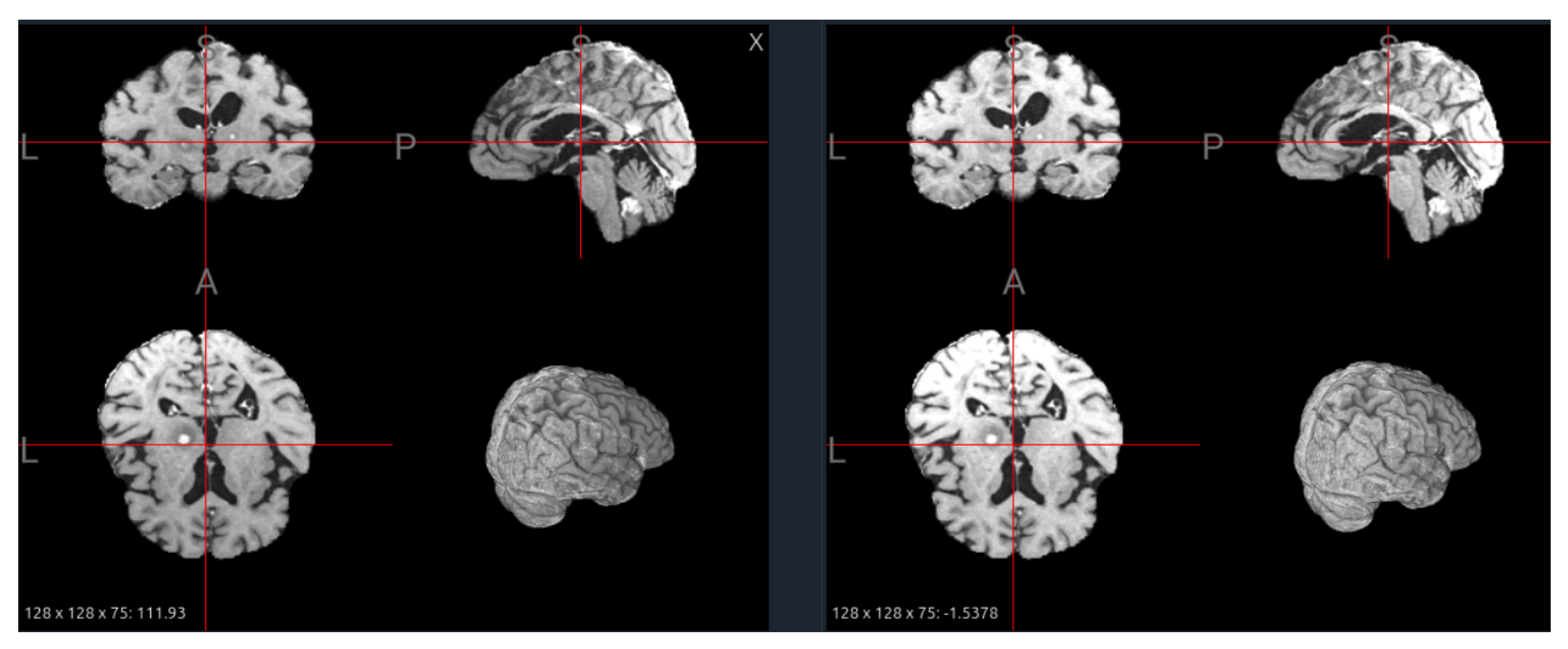 Figure 7: some brain regions appear brighter, while fine structural details become less pronounced. This effect occurs because z-score normalization rescales voxel values relative to the global mean and standard deviation, thereby compressing the overall dynamic range and reducing intensity extremes.