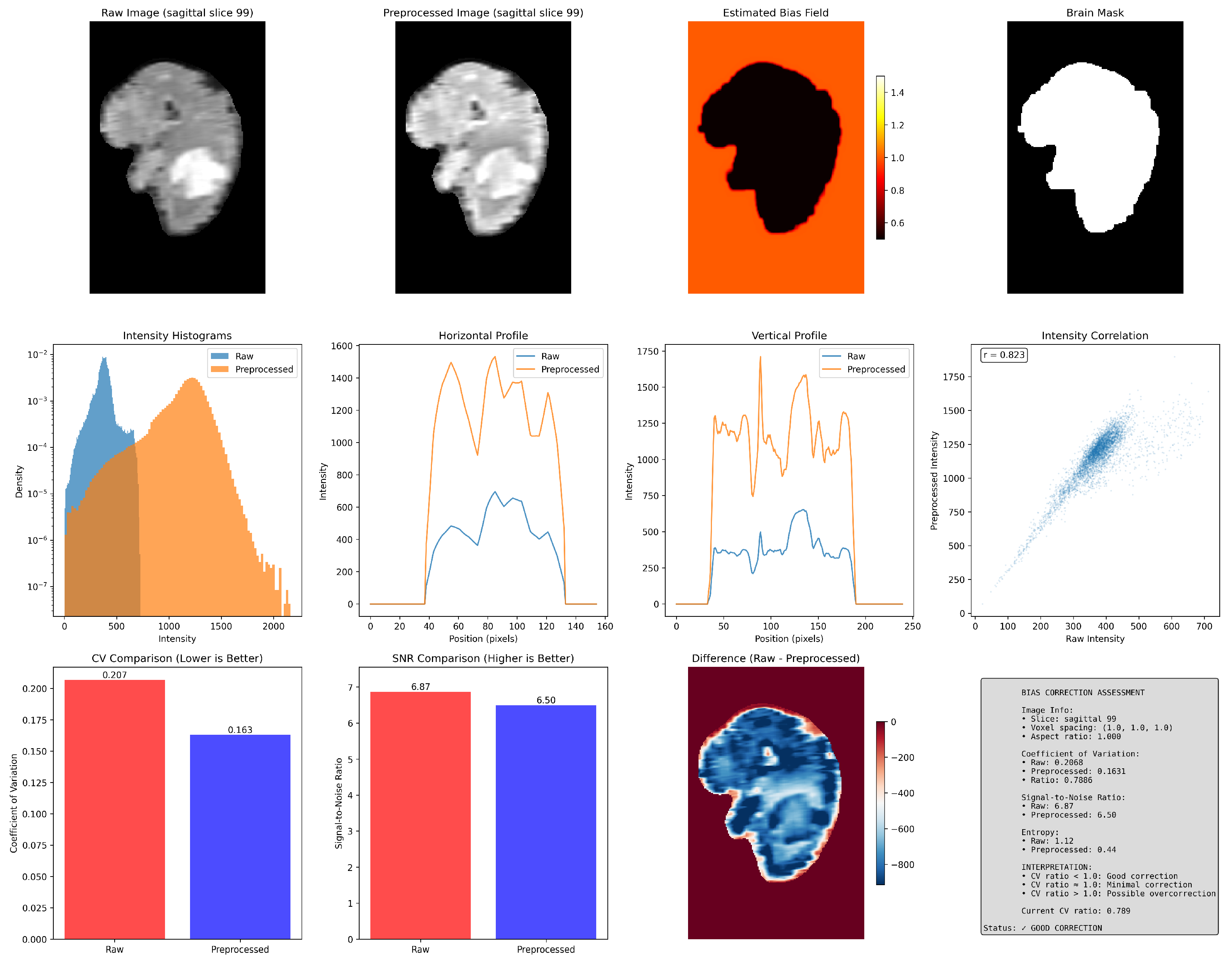 Figure 8. The raw image (top-left) displays uneven brightness—the left side of the brain appears darker due to scanner-related field inhomogeneity. After correction (top-second), the preprocessed image shows more uniform brightness across tissue regions, while the estimated bias field map (top-third) captures the smooth multiplicative field responsible for this nonuniformity. The intensity histograms reveal that voxel intensities have shifted and become more compact, indicating reduced variation between bright and dark areas. The horizontal and vertical profiles show that peaks corresponding to white matter and gray matter are now closer in amplitude, confirming improved intensity consistency. The intensity correlation plot (r = 0.823) shows that the correction maintains overall intensity relationships but rescales them toward a more uniform distribution. Quantitatively, as shown in