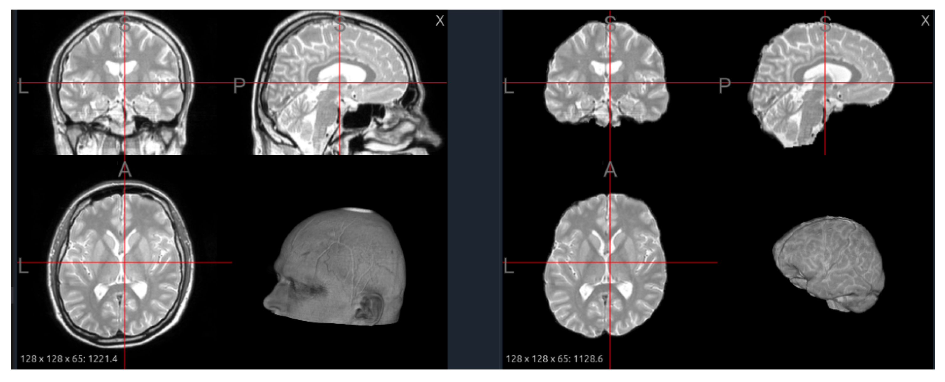 Figure 9 illustrates the effect of skull stripping on a PD image from the IXI dataset, where non-brain tissues such as the scalp and skull are successfully removed, leaving only the intracranial structures for further analysis.