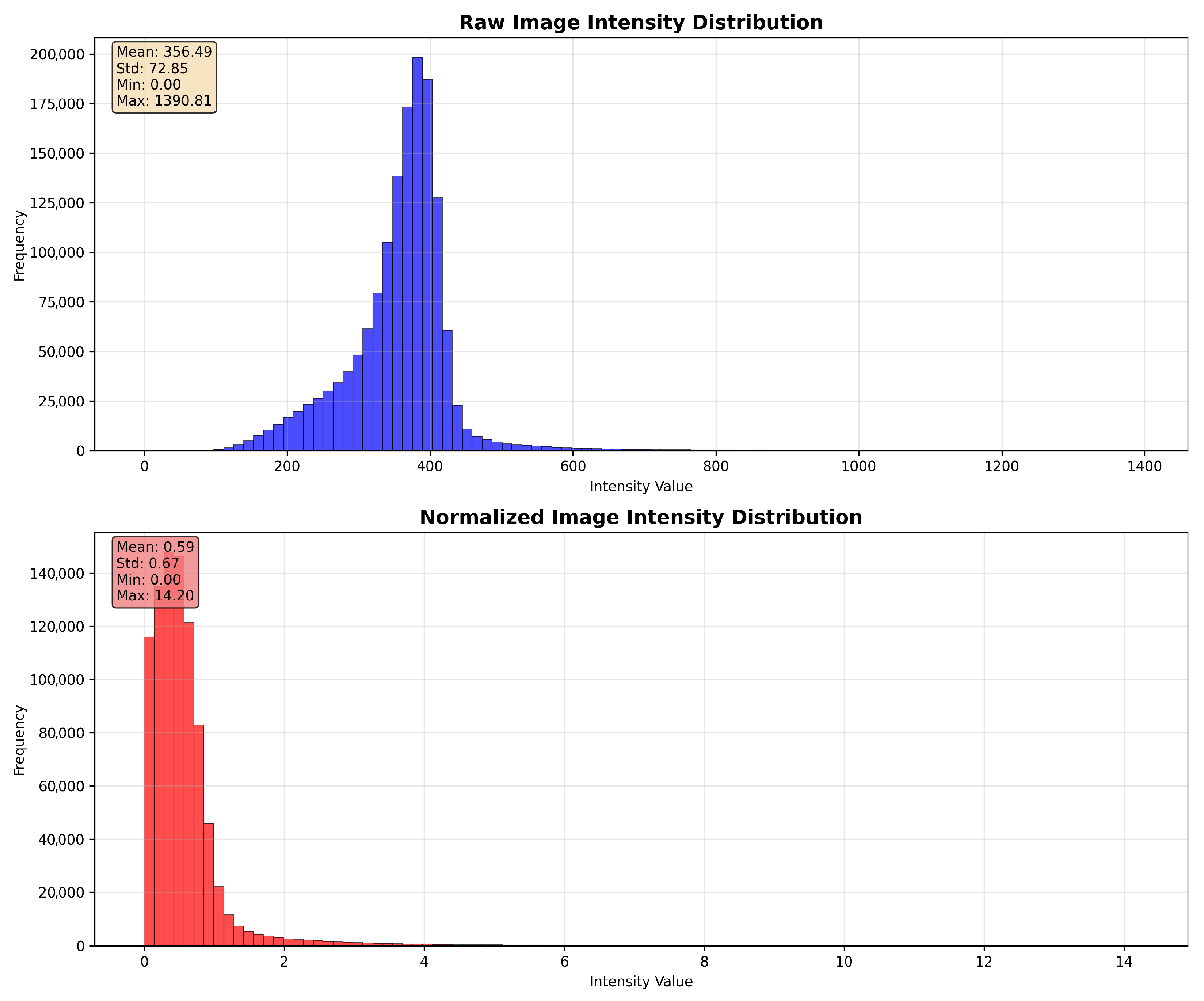 Table 4, the original voxel intensities span a wide range, reflecting strong contrast between bright enhancement regions and darker tissues. After applying z-score normalization, the intensity distribution becomes centered around zero with reduced variance, resulting in a more uniform and balanced appearance across tissues. However, this transformation also alters the visual contrast, as shown in