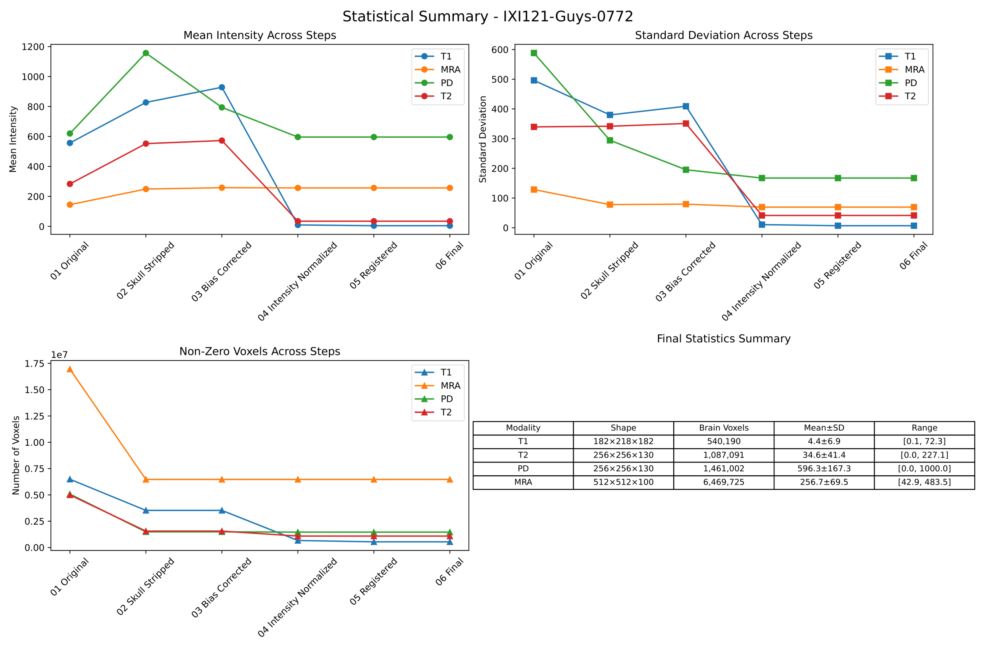 Quantitative evaluation of preprocessing variability: We measure how bias field correction, intensity normalization, skull stripping, registration, and interpolation modify voxel-level statistics and geometry across datasets.