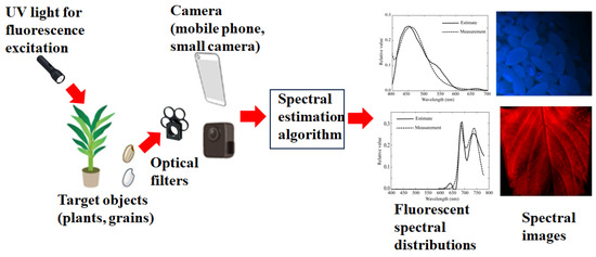 Figure 1 presents an overview of the proposed multiband imaging system for estimating the spectral images of fluorescence spectral distributions emitted from plants and grains. The target plant leaves or rice grains are illuminated with UV light for fluorescence excitation. The emitted fluorescent light passes through filters and is captured by a mobile phone camera or small monochrome camera. The spectral estimation algorithm estimates the spectral distribution of the fluorescence emitted at every pixel point from the captured images and outputs a spectral image. The top and bottom figures on the right of Figure 1 show examples of the emitted fluorescent spectral distributions and sRGB images converted from the spectral images of rice grains and perilla leaves, respectively. It should be noted in Figure 1 that we do not use compact equipment, such as a standard spectrofluorometer. We intend to estimate the fluorescence spectral images emitted from rice grains and plant leaves, including living leaves, outdoors. Therefore, the positions of the excitation light source, target object, and camera should not be fixed, as shown in Figure 1. The system proposed in [12] for measuring fluorescence emission distributions appears to be similar to our idea.