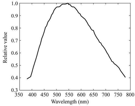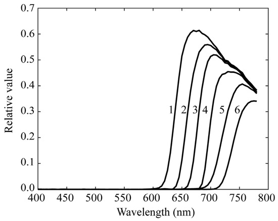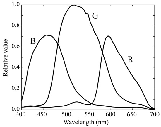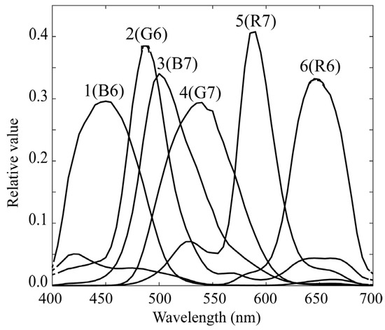 where denotes the spectral power distribution of the fluorescence emitted at each pixel from the target plant, and (i = 1, 2, …, 6) denotes the spectral sensitivity functions of the multiband imaging systems. The wavelength range of integration is in the visible range (400–700 nm) for the first imaging system of rice grains and in a wider range (400–780 nm), including red to far-red, for the second imaging system of plant leaves. The sensitivity functions presented in Figure 5 and Figure 8 correspond to the first and second systems, respectively. They are defined by multiplying the RGB spectral sensitivity functions of the mobile phone camera and the spectral transmittance of the additional color filters for the first system, and by multiplying the spectral sensitivity functions of the monochrome camera and the spectral transmittance of the additional sharp-cut filters for the second system.