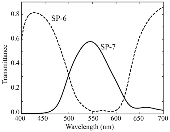 As the fluorescence emission from lipids in rice grains has a spectral distribution mostly in the visible wavelength range, we used a mobile phone camera with RGB channels (iPhone 6s; Apple Inc., Cupertino, CA, USA) and made it multiband. A similar multiband method was proposed to calculate the surface spectral reflectance [18]. The camera depth was set to 12 bits. The curves of the spectral sensitivity functions of the RGB camera are shown in Figure 3. For multiband image acquisition, we selected two color filters from a set of commercial color filters (Fujifilm Optical Filter, Fujifilm, Tokyo, Japan). Figure 4 shows the spectral transmittance curves of the filters. Combining these transmittances with the original spectral sensitivities yields different sets of trichromatic spectral sensitivity functions. The SP-6 filter was effective in shifting the spectral sensitivity to short and long wavelengths in the visible range, whereas the SP-7 filter was effective in shifting the spectral sensitivity to middle wavelengths. Thus, two sets of modified trichromatic spectral sensitivities resulted in an imaging system with six spectral bands in the visible wavelength region. Figure 5 shows the overall spectral sensitivity functions of the proposed multiband imaging system with six channels constructed using an RGB mobile phone camera and two color filters. Notably, this multiband imaging system is suitable for fluorescence image acquisition over the entire visible range. Each filter was attached to the front of a mobile phone camera lens. The image of each channel was acquired using Adobe’s digital negative (DNG) format.