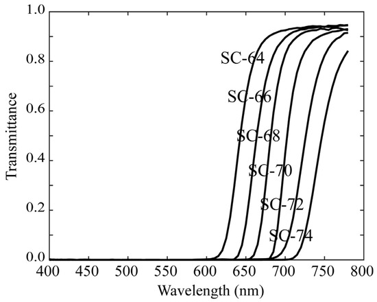 Chlorophyll fluorescence emissions from plant leaves have a spectral distribution in the red-to-far-red wavelength regions. Because the mobile phone camera did not have sufficient sensitivity in this wavelength region, as shown in Figure 3, we used a monochrome camera and made it multiband with additional filters. The camera used was a monochrome CCD camera with a 12-bit dynamic range and a Peltier cooling (QImaging, Retiga 1300, Shoshin EM, Aichi, Japan). Additional optical filters were selected such that the combination of camera sensitivity and filter transmittance resulted in overall spectral sensitivity in the red-to-far-red region. Figure 6 shows the spectral sensitivity function of the monochrome camera, which has a sensitivity of approximately 800 nm. Figure 7 shows the spectral transmittance curves of six sharp-cut filters, SC-64, SC-66, SC-68, SC-70, SC-72, and SC-74 (Fujifilm Optical Filter, Fujifilm, Tokyo, Japan), which were selected for multiband image acquisition. Figure 8 exhibits the overall spectral sensitivity function of the multiband imaging system. For the filters, we fabricated six holders using a 3D printer and fixed the camera on a tripod.
