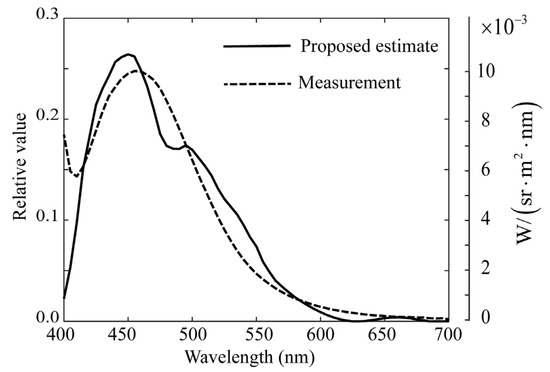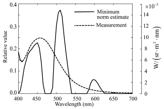 First, the minimum norm estimate was obtained using Equation (6). Figure 11 shows this estimate, which is compared with the spectral distribution measured using a spectroradiometer. In the figure, the estimated and measured are normalized to . The minimum norm estimate had a large sum of squared errors (0.5807) and is unreliable. The increase in the measured spectral curve at 400 nm was attributed to the effect of the illuminated UV light. To compare the estimated spectral distribution with the physical quantities measured by the spectroradiometer, we added a scale in the physical quantities with the unit to the right of Figure 11.